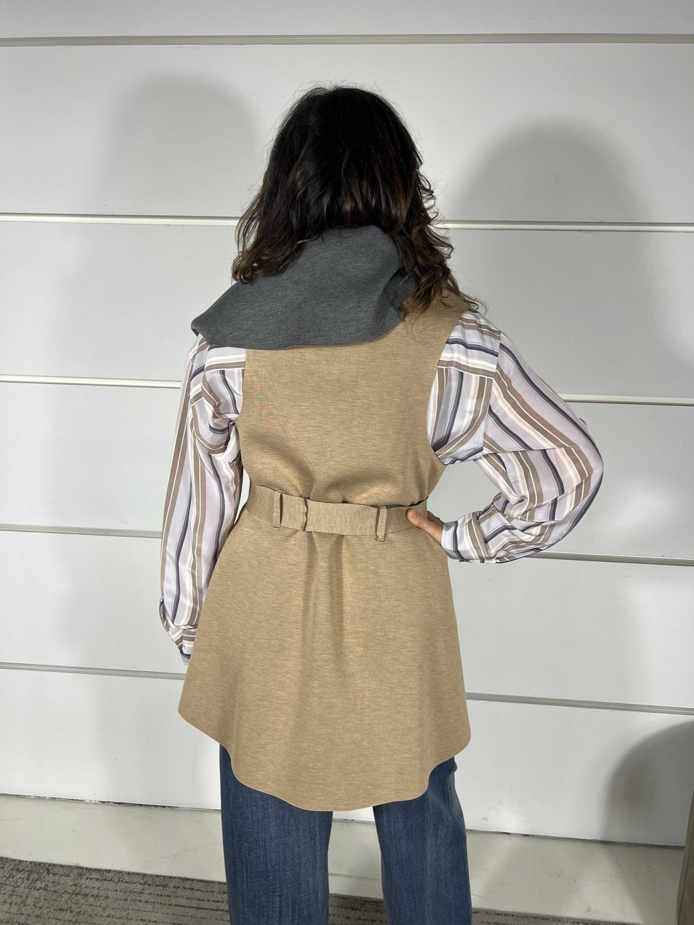 Gilet Carla G medio lungo in scuba double, grigio e beige, con chiusura cintura in vita. La modella è alta 170 cm e indossa la 42. Composizione: 50% vi 50% pl.
