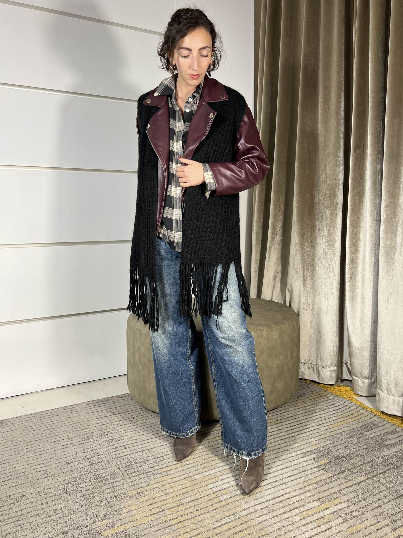 gilet lungo nero in misto lana con frange