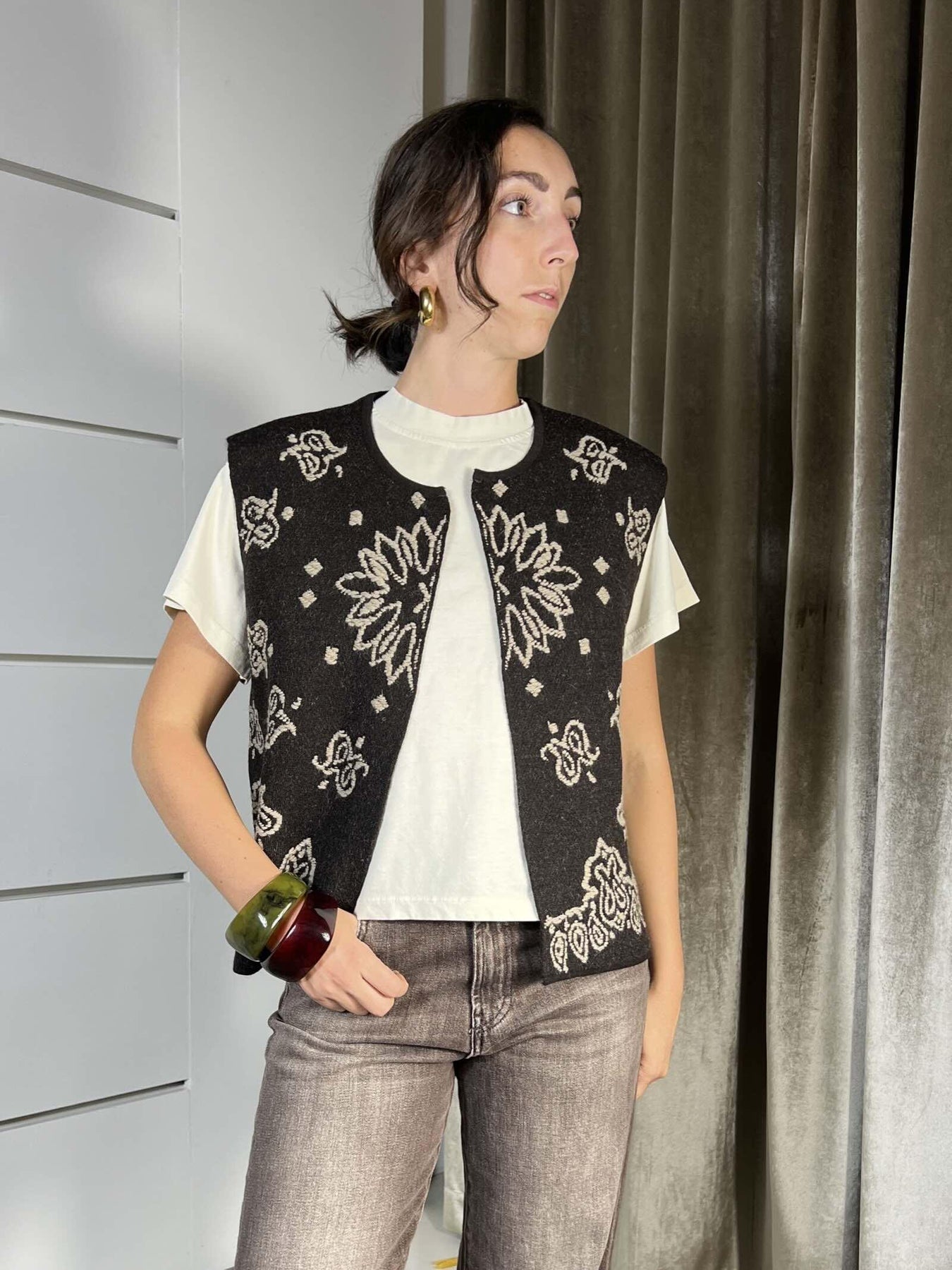 Gilet Tensione in in maglia moro con ricami taupe, in misto lana. la modella indossa la 40 ed è alta 172cm, veste da una38 a una 44. Composizione m. lana