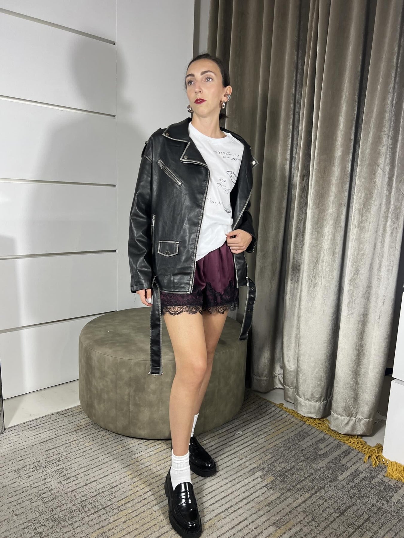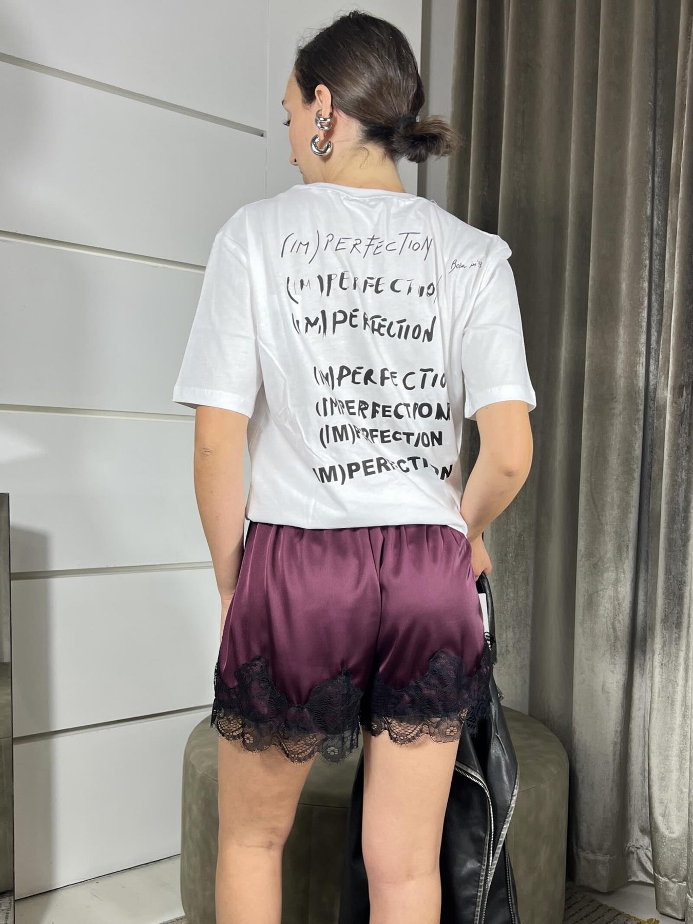 Short Vicolo bordeaux satin con pizzo nero, con elastico in vita. LA MODELLA è UNA 40 ED è ALTA 172CM, VESTE DA UNA 38 A UNA 44. cOMPOSIZIONE 97%pl 3%ea