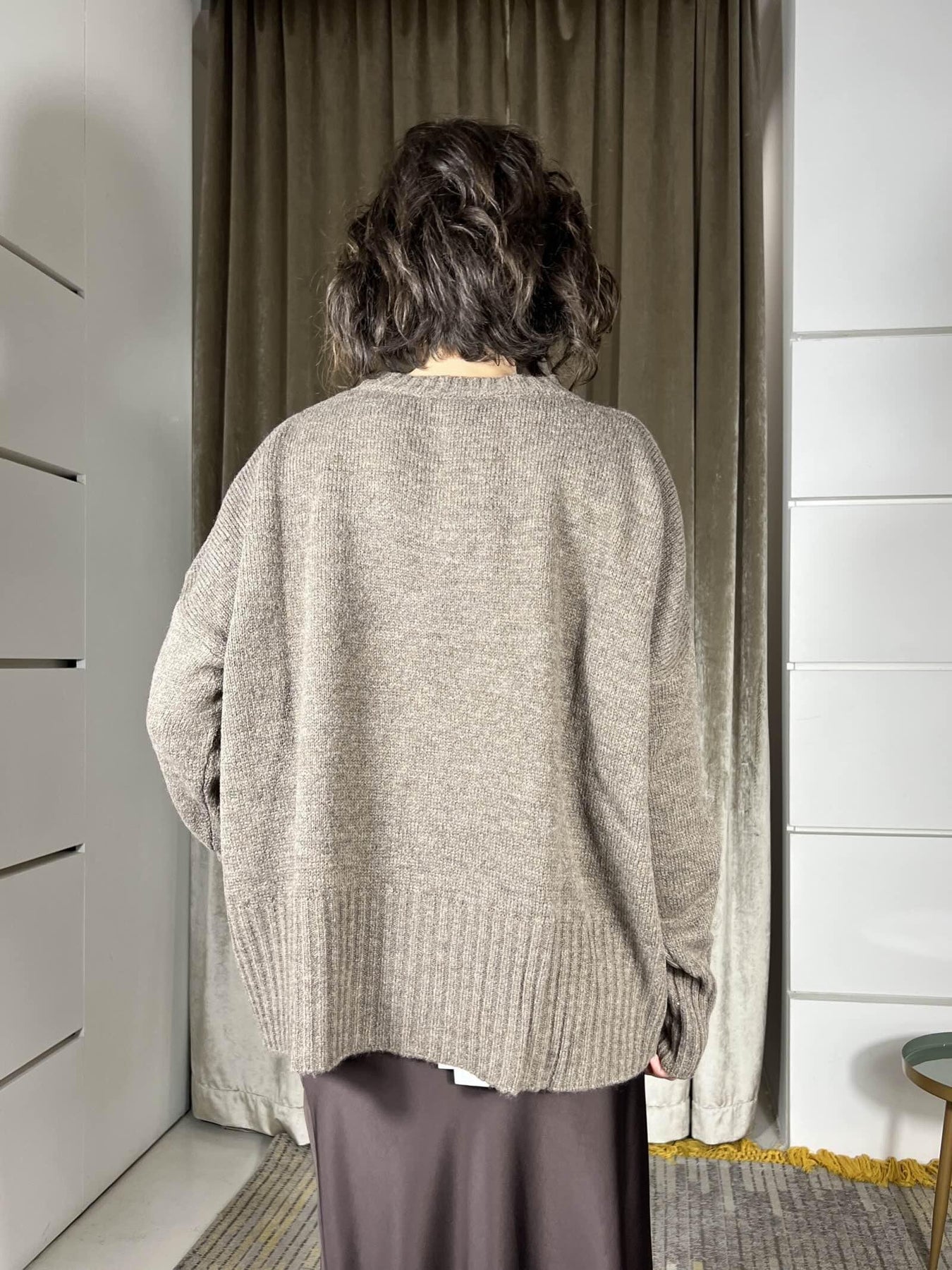 maglione Tensione In girocollo rust con coste in misto lana, rasata, modello over, la modella è una 40 ed è alta 172cm, veste da una 38 a una 46. Composizione 57% acrilico 29% poliammide 7%viscosa 7% lana