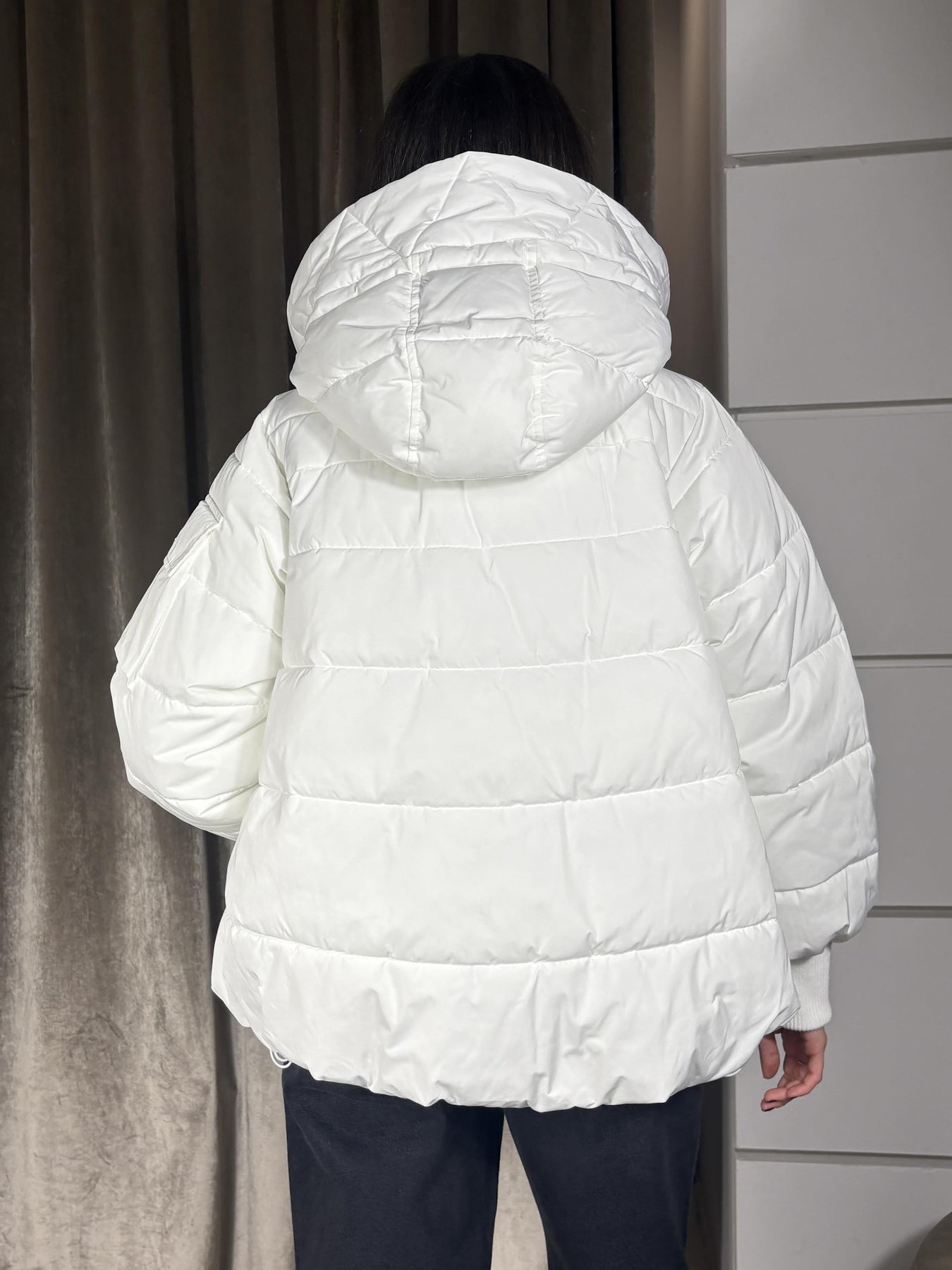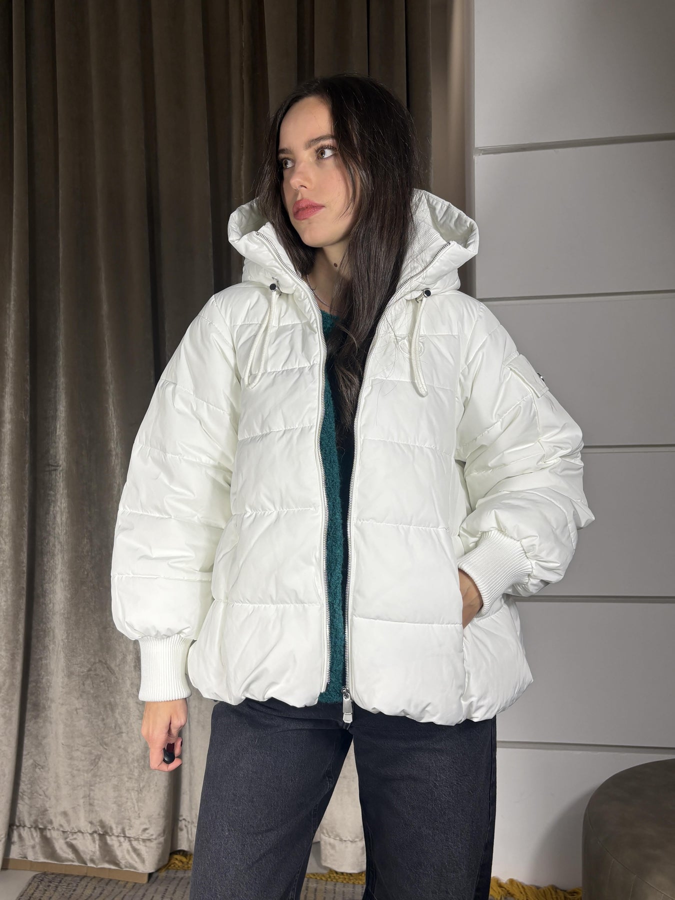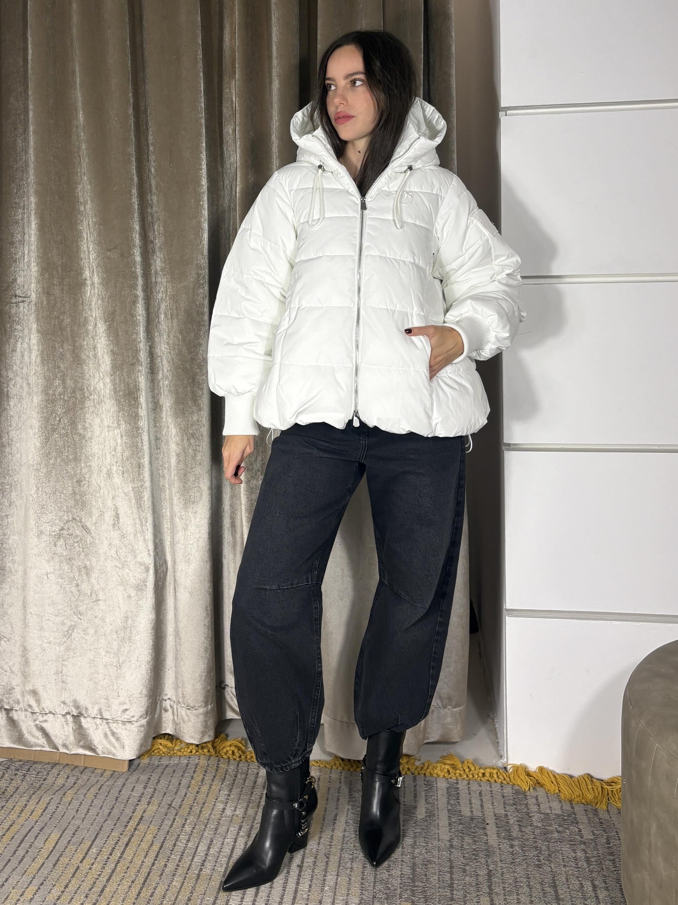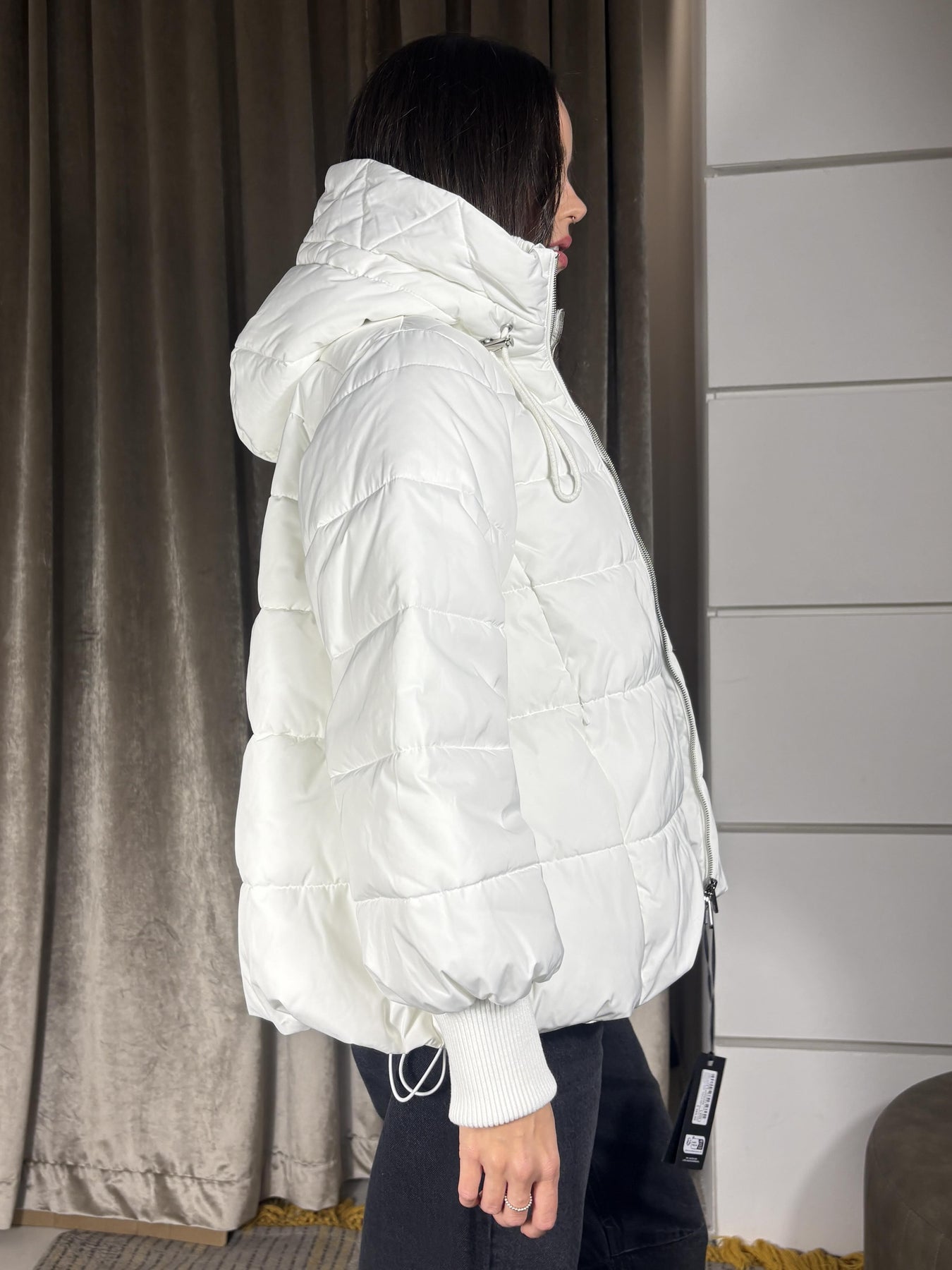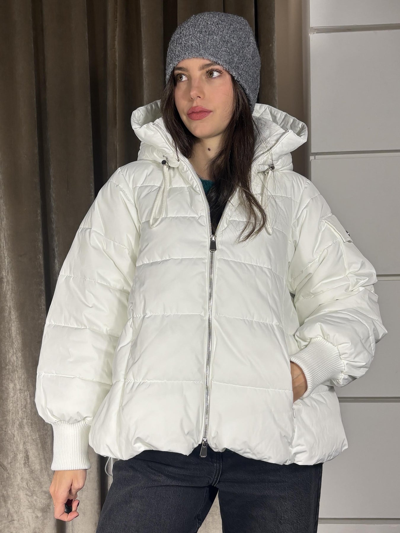Imbottito Pinko, corto, bianco, leggermente a campana, con dettagli di stampo sportivo: tessuto opaco, lavorazione in maglia sul collo alto e sui polsini, doppio cursore e ampio cappuccio con coulisse. La modella indossa la tg. S, ed è alta 1,72 m. Composizione: ES1 - 1° Tessuto Esterno: 100%PL - ES2 - 2° Tessuto Esterno: 98%PL 2%EA - FO1 - 1° Fodera: 100%PL - FO2 - 1° Fodera: 100%PL - IMB - Imbottitura: 100%PL
