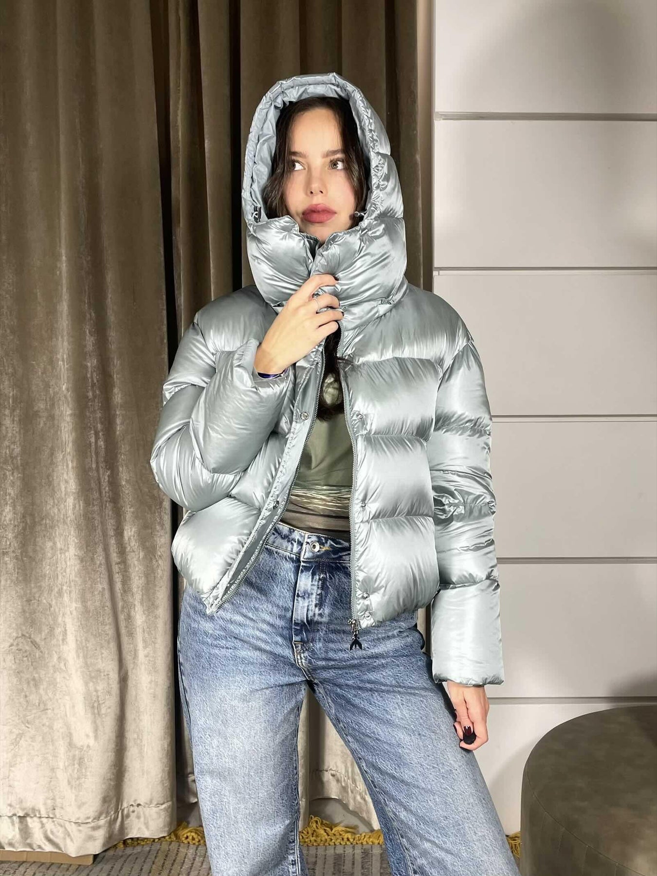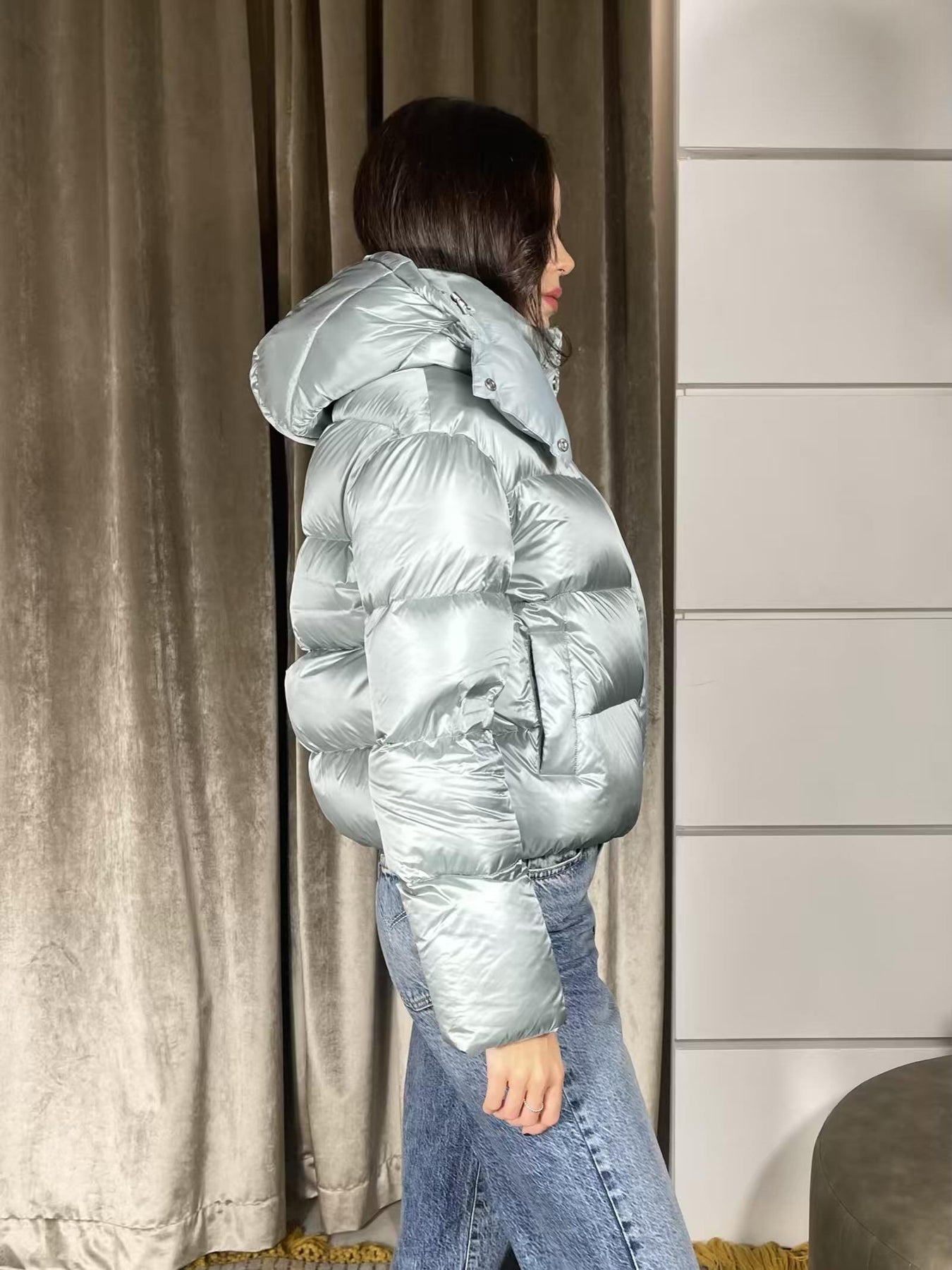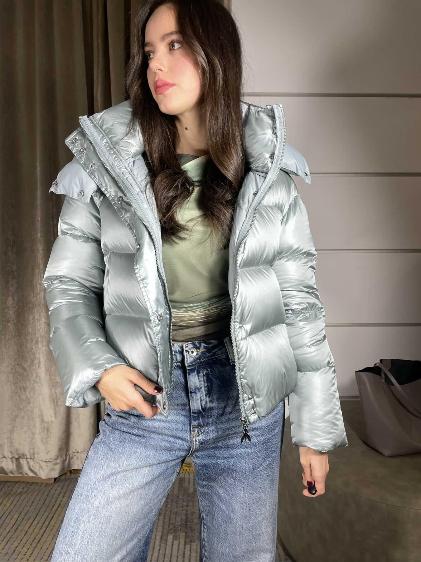 Piumino imbottito di Pinko, color verde chiaro, con cappuccio removibile, ultraleggero ma caldo. Chiusura con zip e bottoni automatici. Manica lunga. La modella indossa la tg. 40 ed è alta 1,72m. Composizione: Tessuto principale: 100% PoliammideImbottitura principale: 90% Piumino D'anatra, 10% Piuma D'anatra