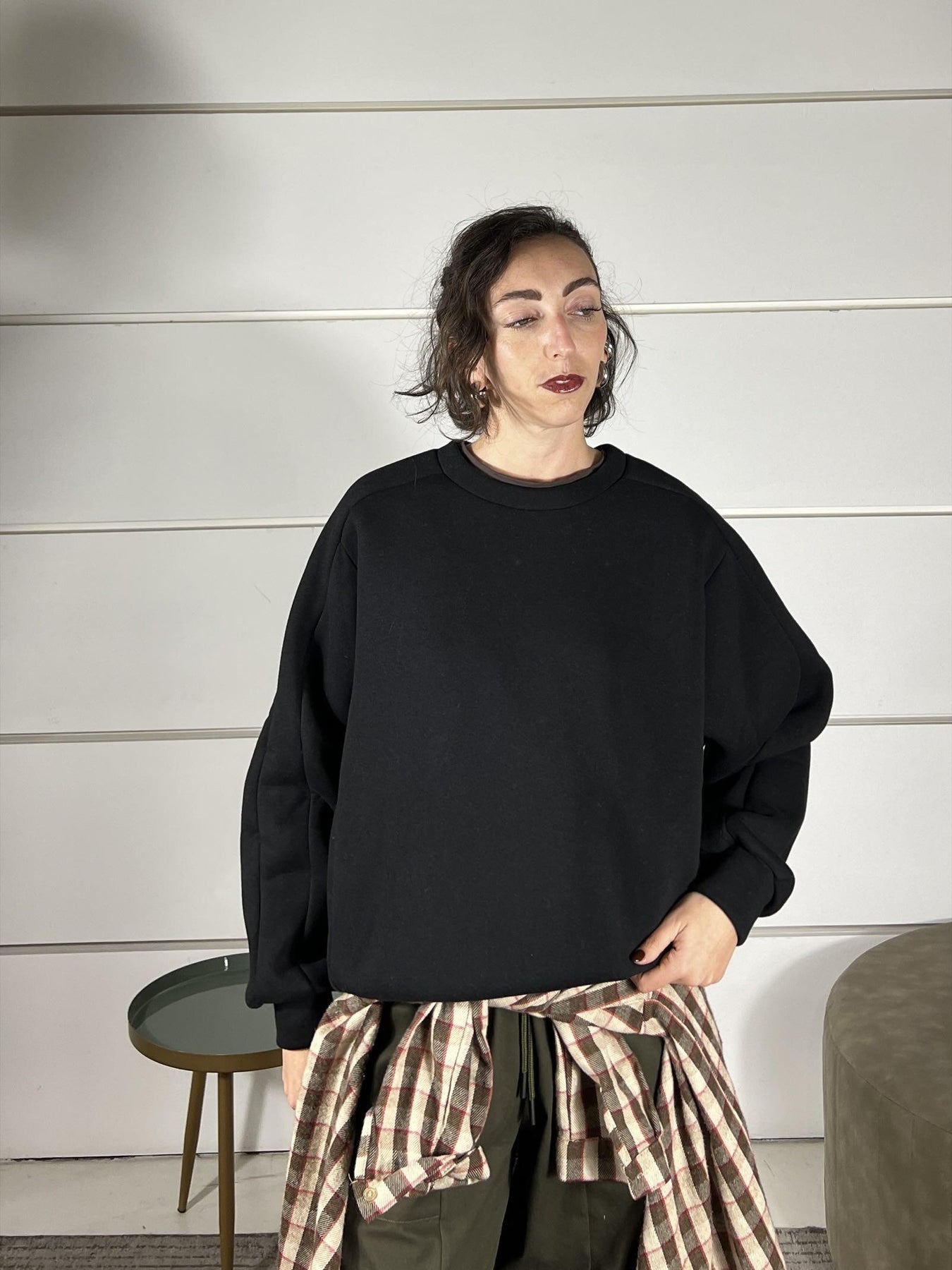 felpa Have One over felpata con polsini nera. La modella è alta 172 cm e veste da una 38 a una 44. Composizione: 55%co 45%pl.
