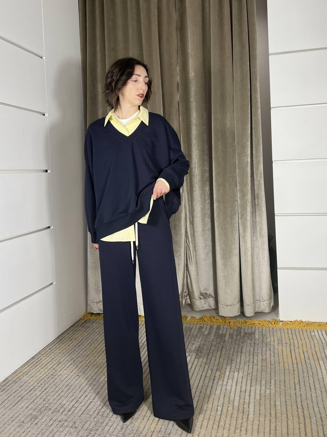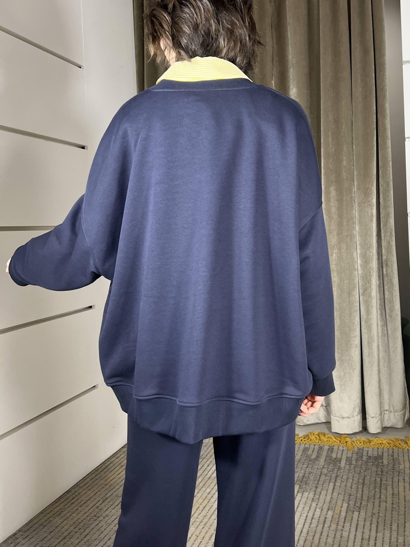 Felpa Vicolo over, scollo a v, garzata, blu. volendo si abbina al pantalone. la modella è una 40, veste da una 38 a una 46. Composizione 65%co 35%pl 95%co 5%ea