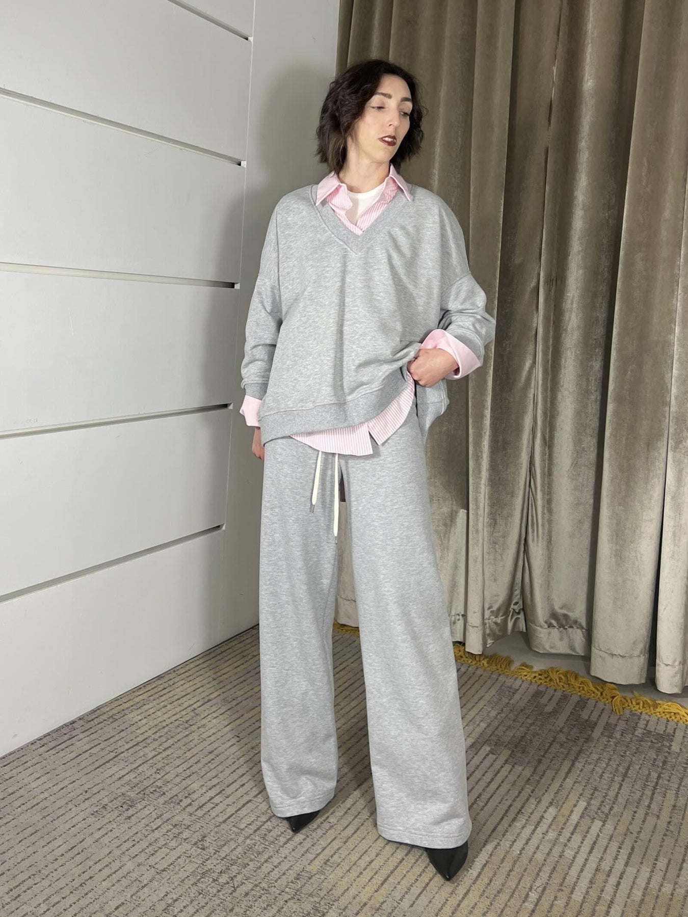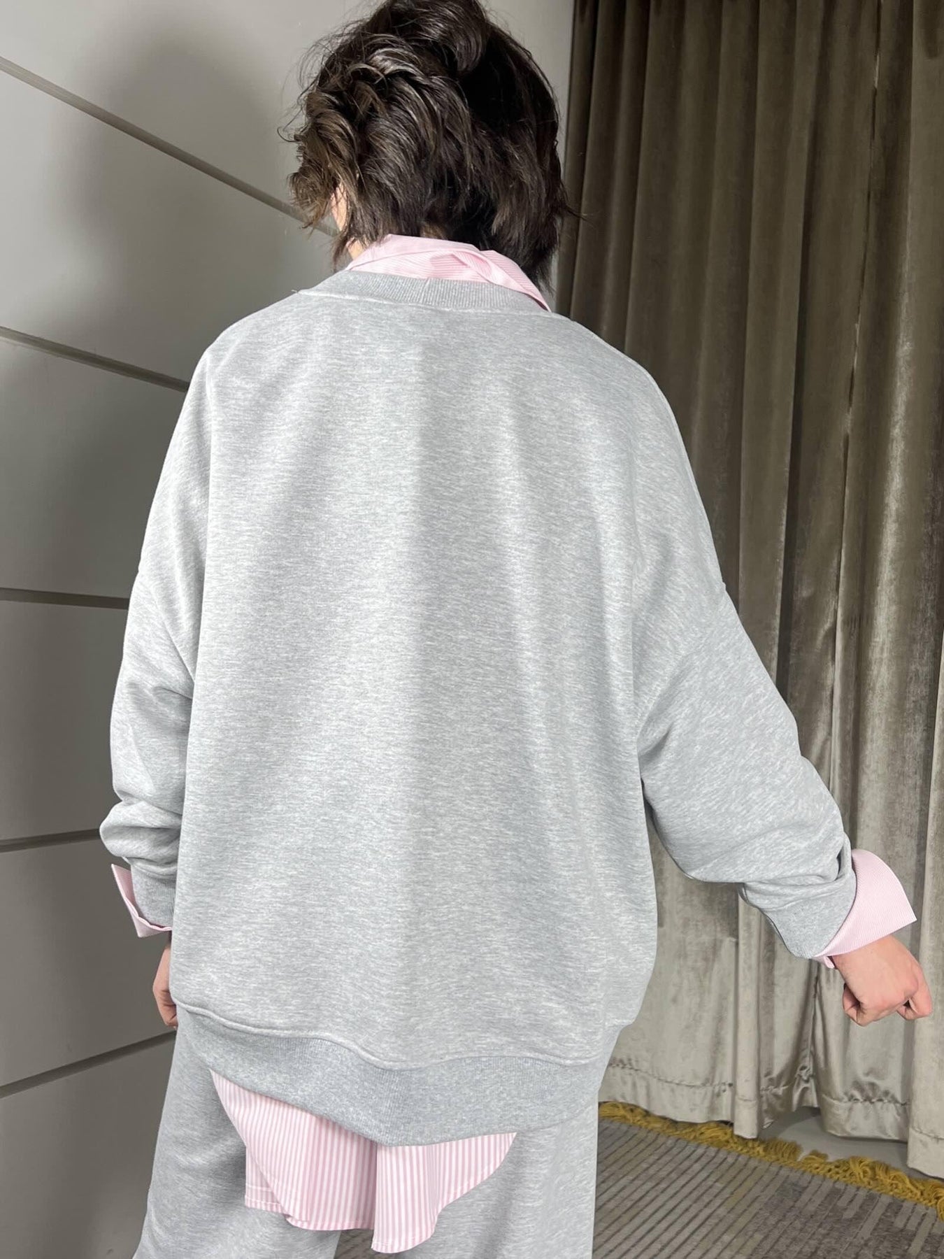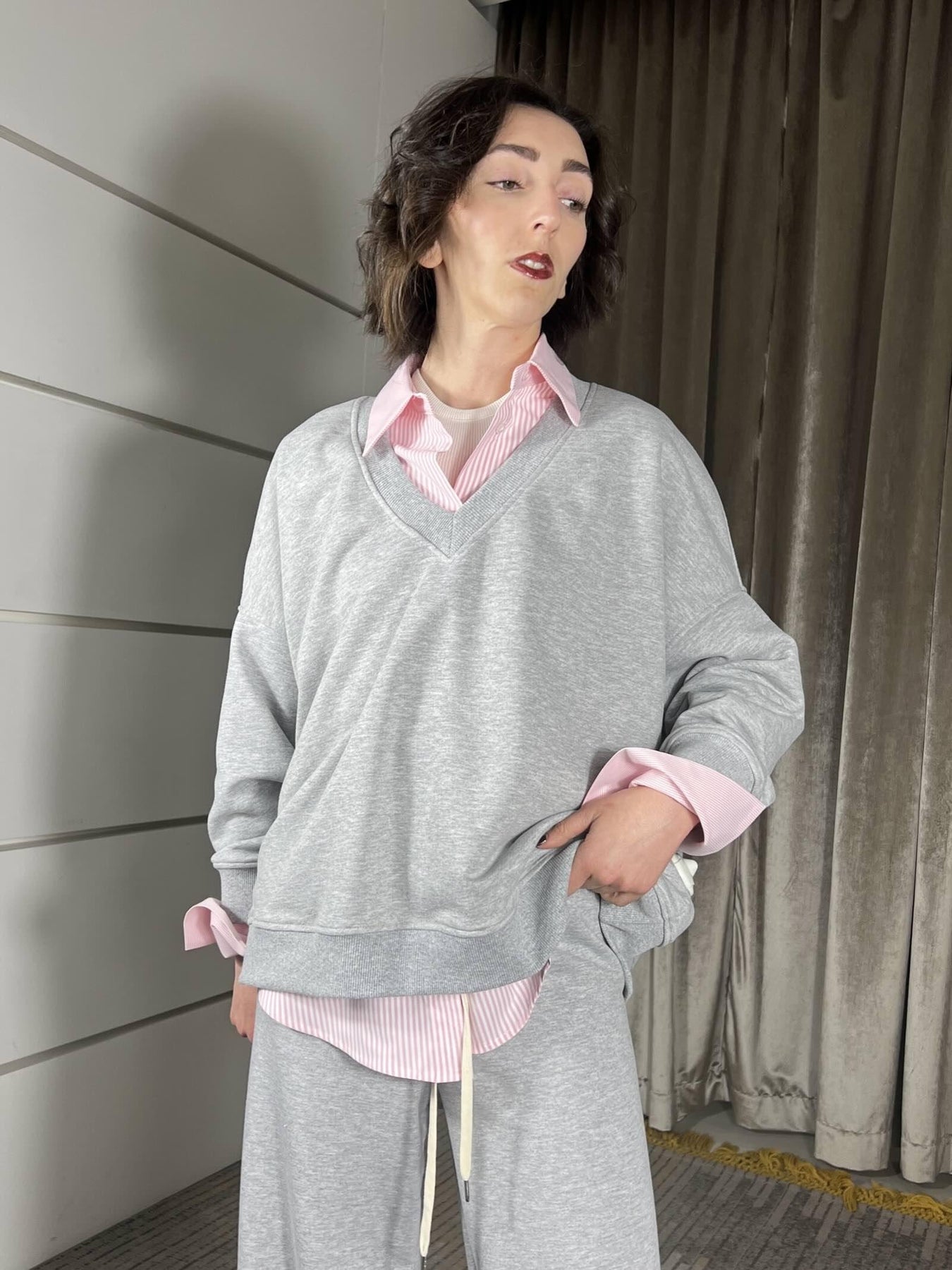Felpa Vicolo over, scollo a v, garzata, grigia, volendo si abbina al pantalone. la modella è una 40, veste da una 38 a una 46. Composizione 65%co 35%pl 95%co 5%ea