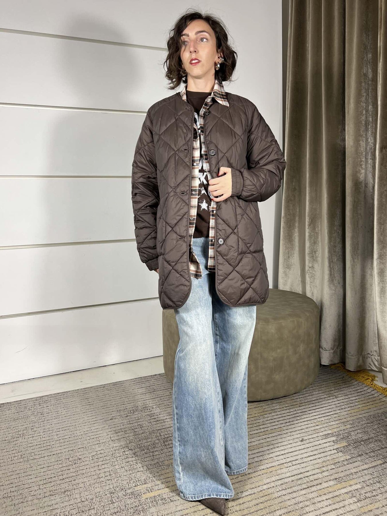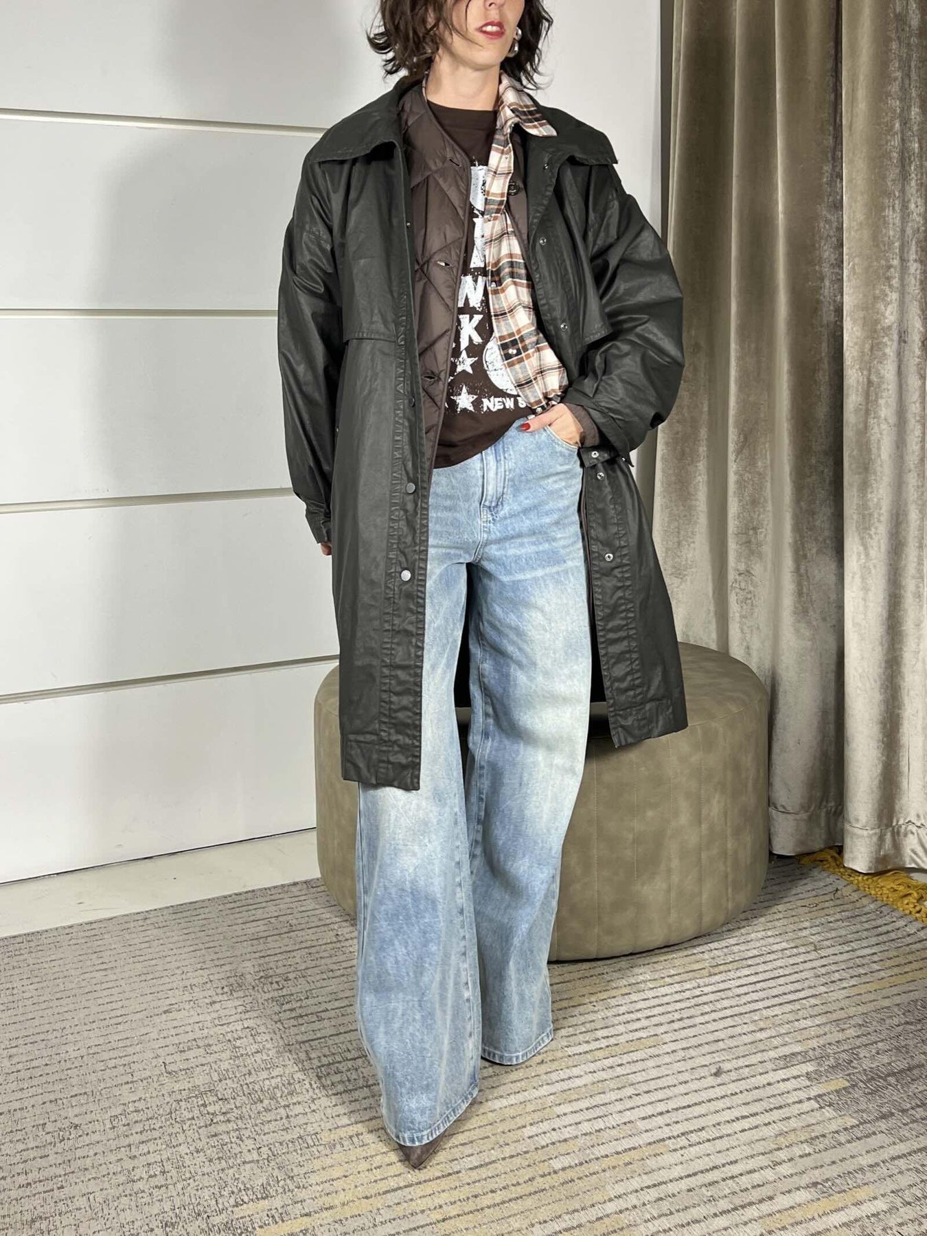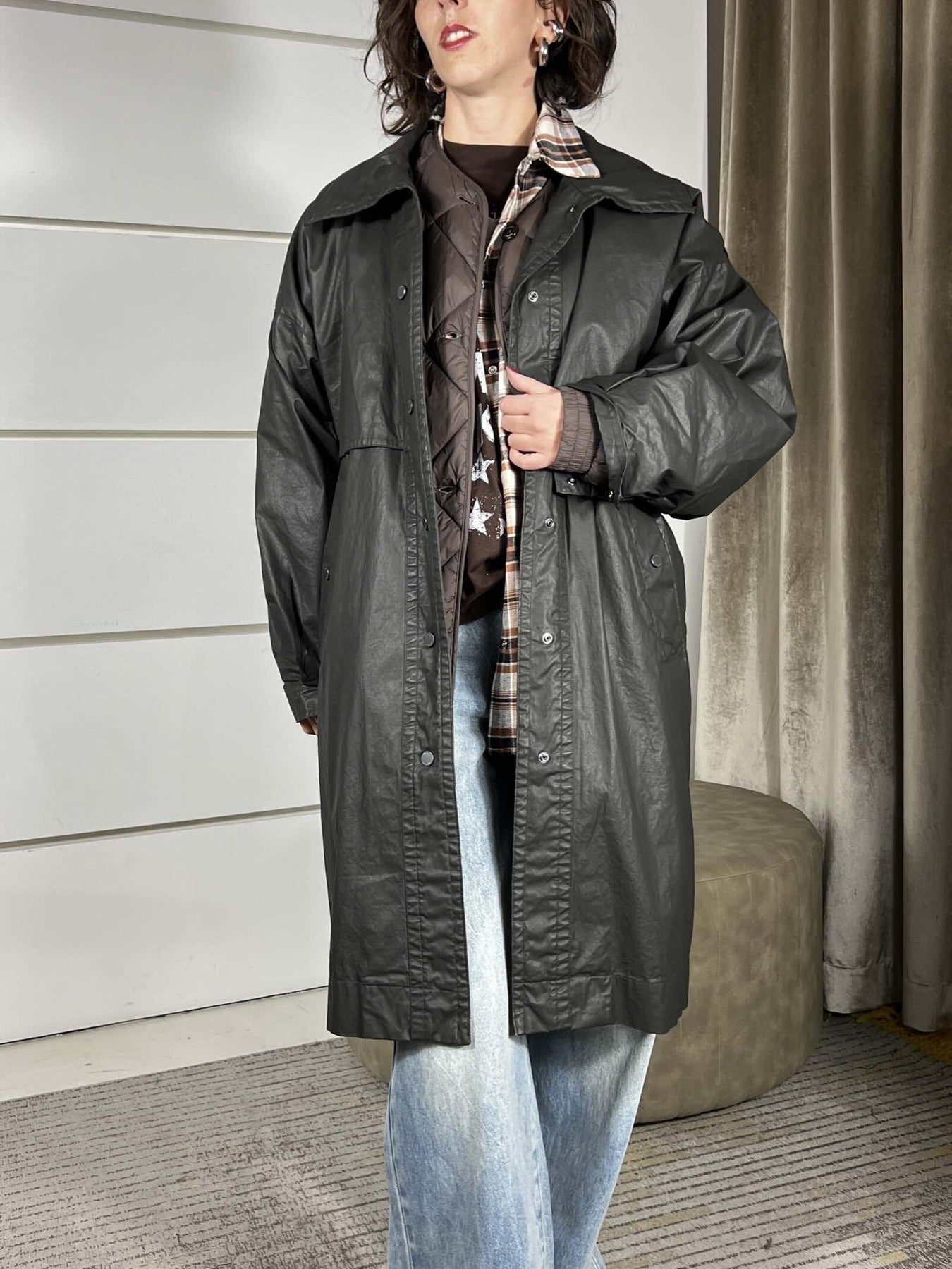 trench cerato Vicolo verde militare, con interno staccabile, 2 giubbotti in uno, La modella indossa la s ed è alta 172cm, veste abbondante. Composizione 100% polyurethane back 100%co inner 100%ny padding 100%pl