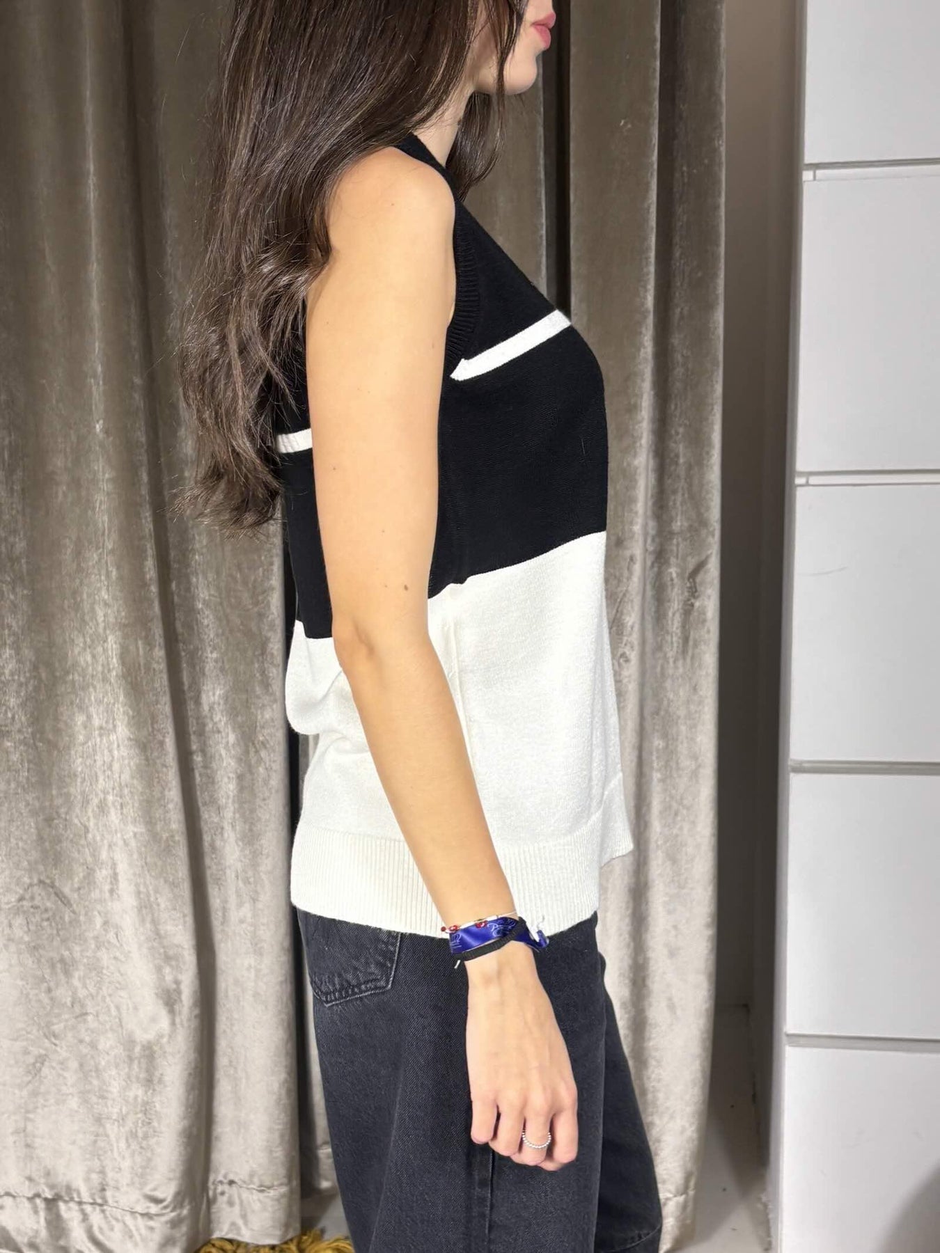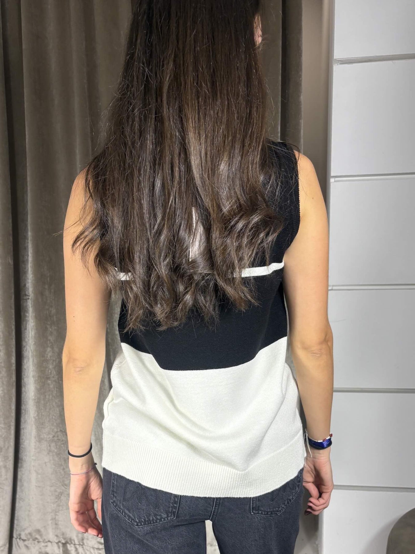 Canotta Carla G. a spalla larga, in viscosa elasticizzata a righe bianco e nero. Fit morbido. La modella indossa la tg. 40 ed è alta 1,72 m. Composizione: 51% vi 31% pl 18% pa.