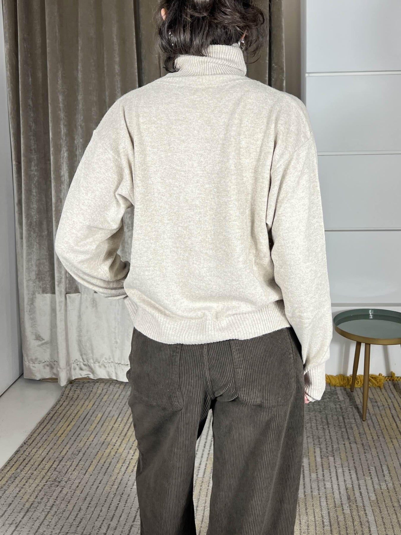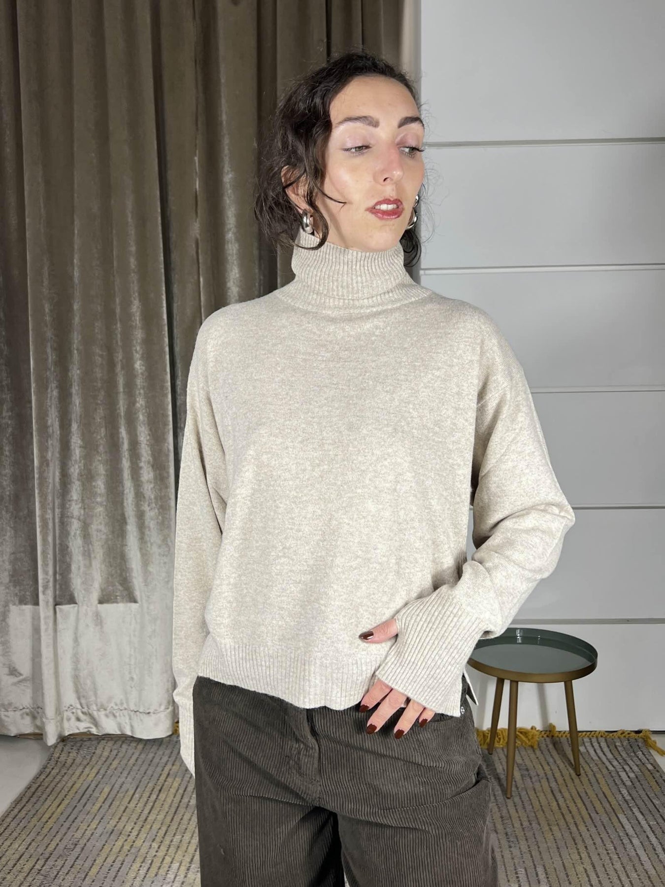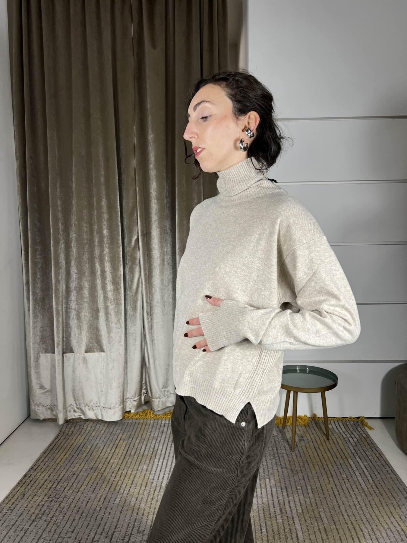 Maglia Vicolo collo alto con manicotto, in misto lana, volendo si abbina al pantalone. La modella è una 40 ed è alta 172cm, veste da una 38 a una 44. Composizione 40%vi 30%pa 25%wo 5%ws