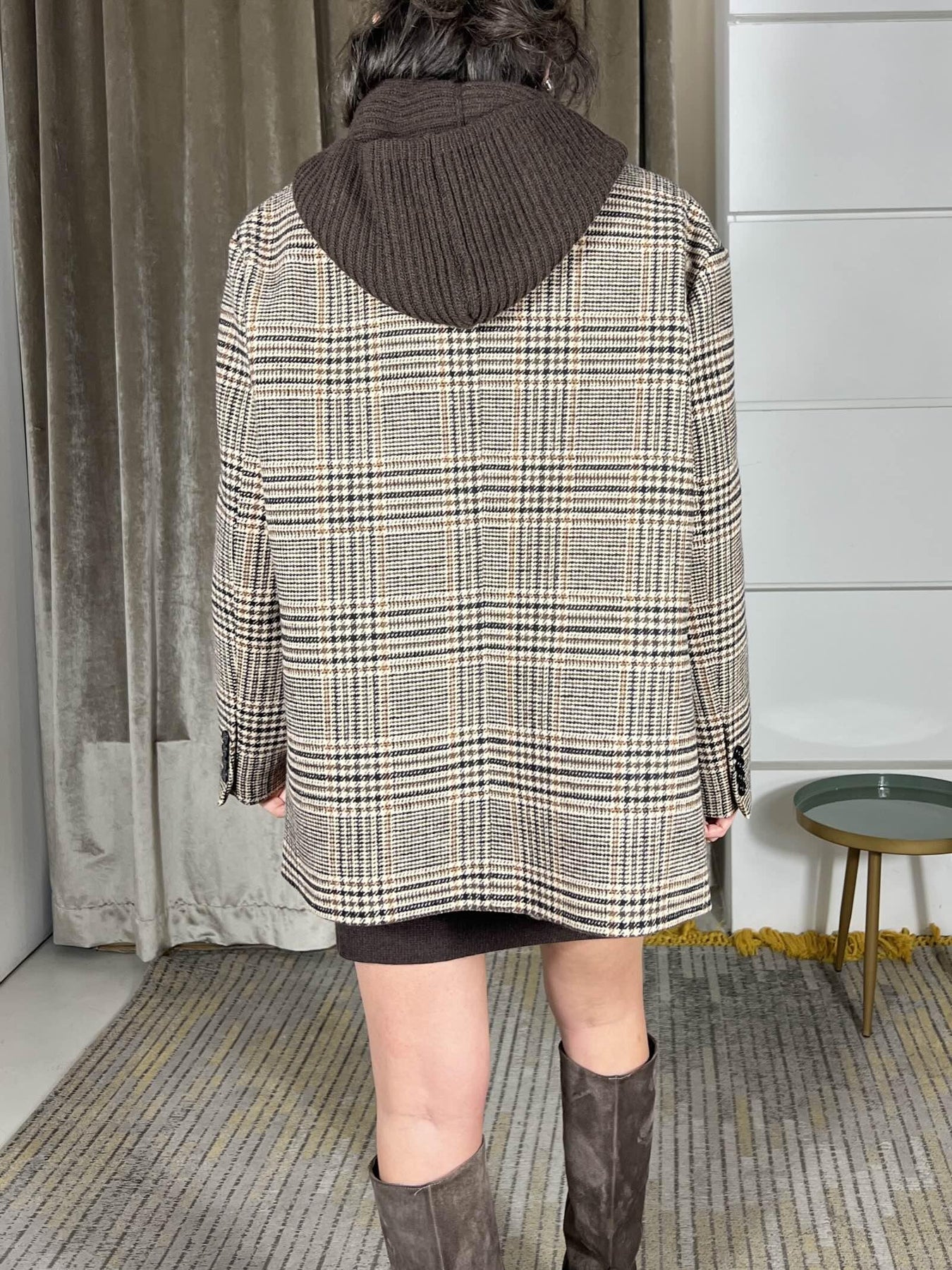 Giacca cappotto Vicolo pied de poule, mor burro e bruciato, con cappuccio staccabile in maglia, modello over, la modella è una 40 ed è alta 172cm, veste da una 38 a una 46. Composizione 59%pl 14%vi 10%pc 7%ny 5%co 5%af 62%ac 38%vi