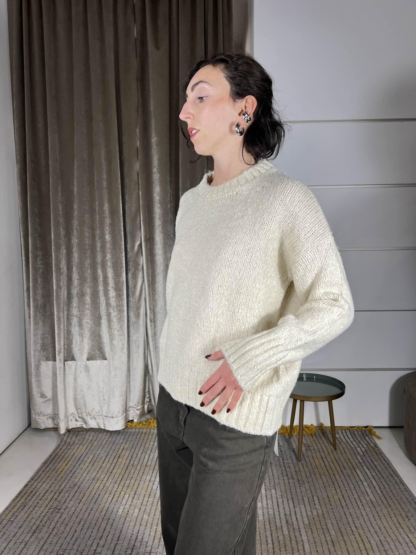 maglione Vicolo girocollo over, burro , in misto lana e alpaca, la modella è una 40 ed è alta 172cm, veste da una 38 a una 46. Composizione 62%acrilico 18%poliestere 8%lana 8%viscosa 4%alpaca