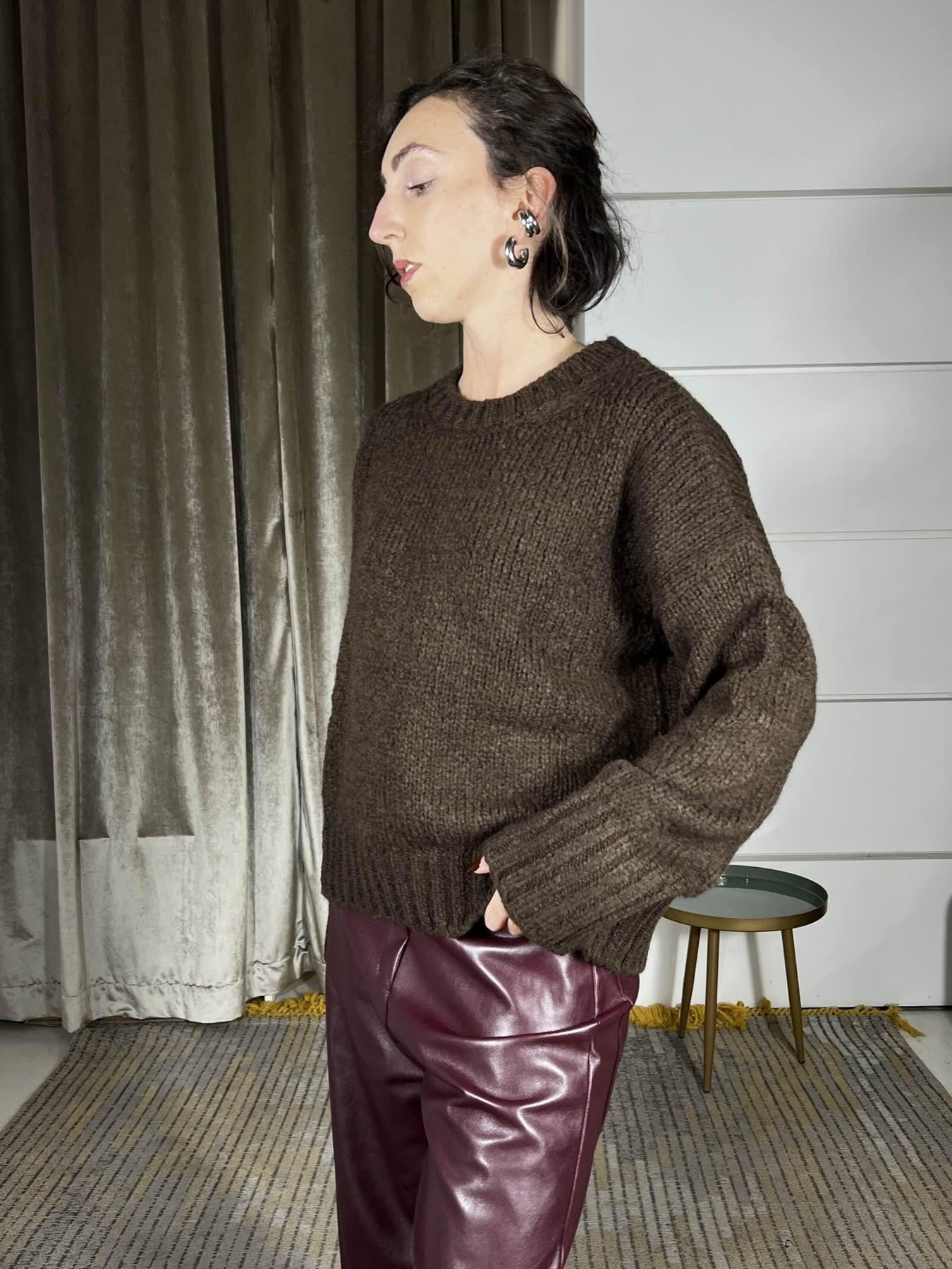 maglione Vicolo moro girocollo over, in misto lana e alpaca, la modella è una 40 ed è alta 172cm, veste da una 38 a una 46. Composizione 62%acrilico 18%poliestere 8%lana 8%viscosa 4%alpaca