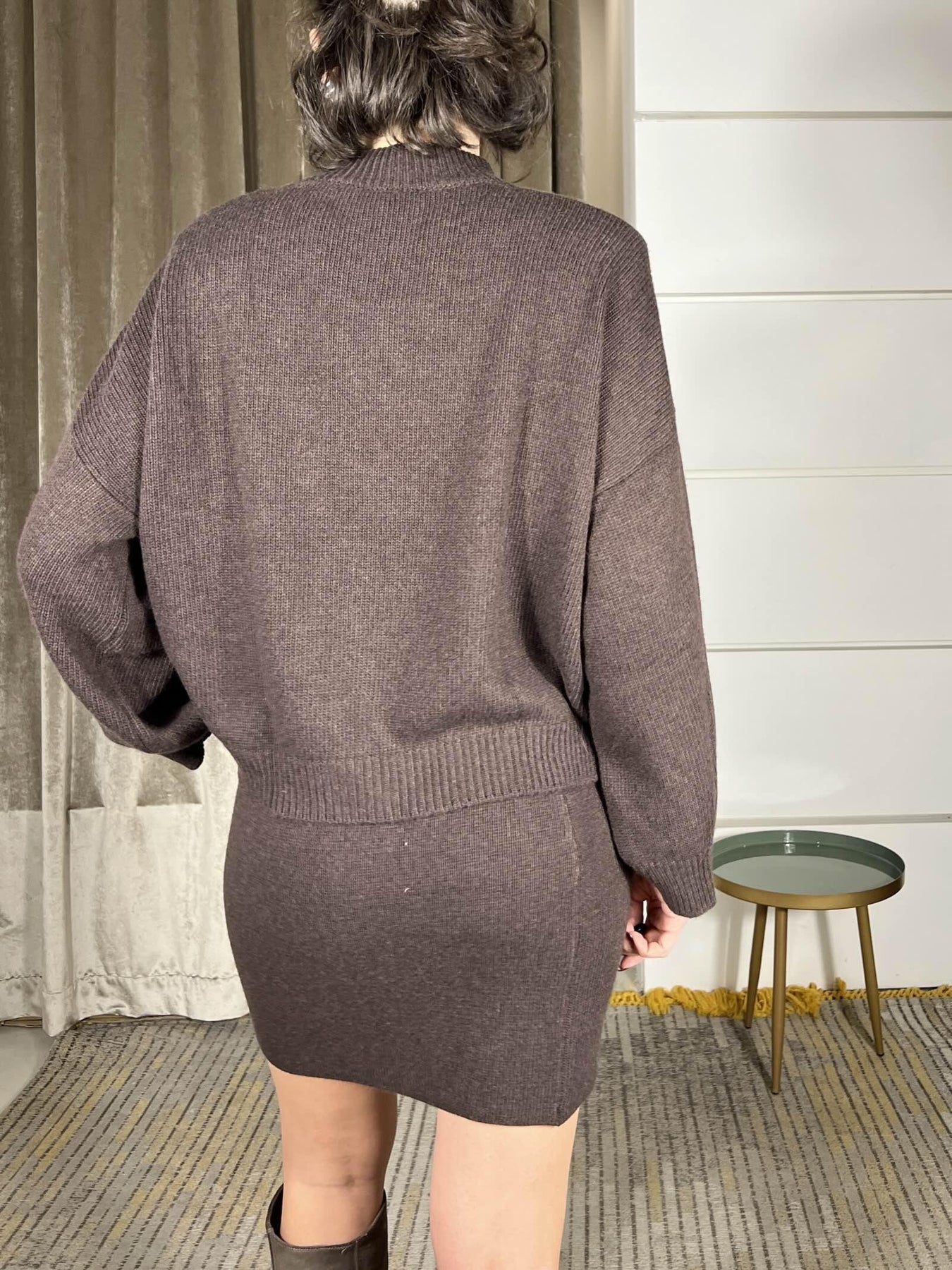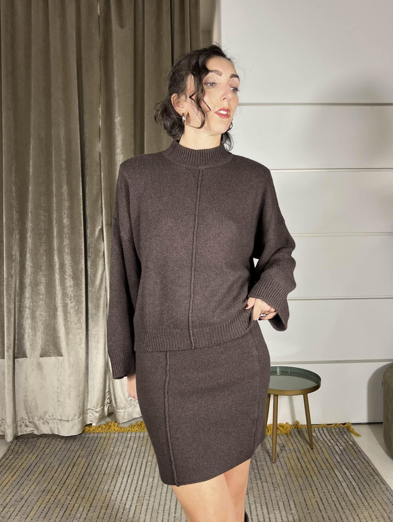 minigonna in maglia, si abbina al maglione, in misto lana, Vicolo, con elastico in vita, la modella è una 40 ed è alta 172cm, veste poco da una 38 a una 40. Composizione 40%vi 30%pa 25%wo 5%ws