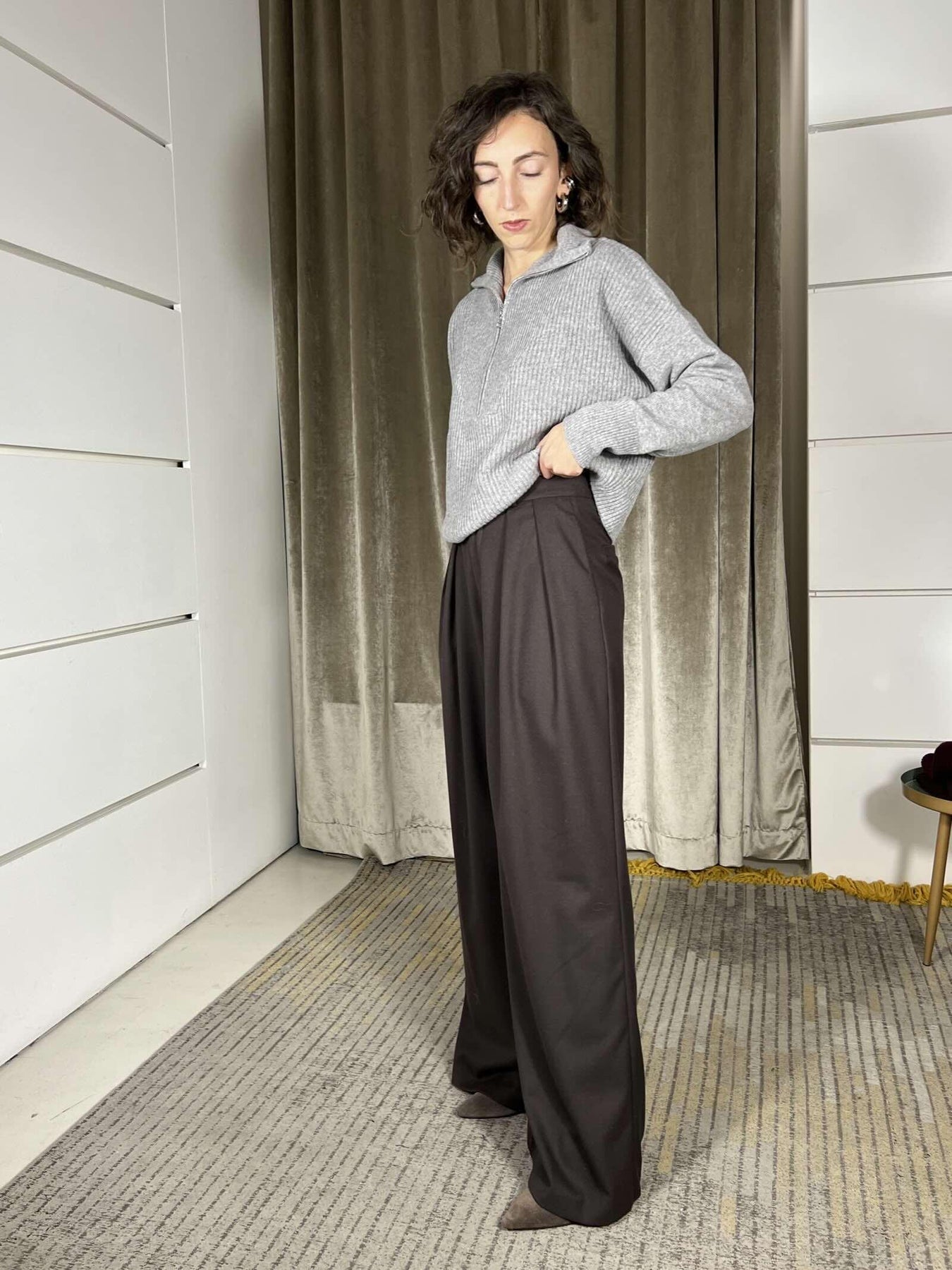 pantalone Vicolo moro a palazzo con pinces, in calda viscosa, la modella indossa la s d è alta 172cm. Composizione 65%pl 33%vi 2%el