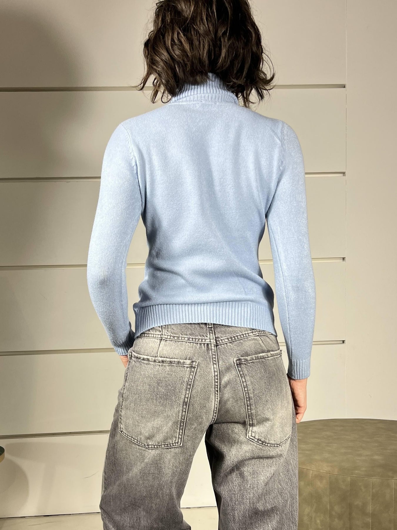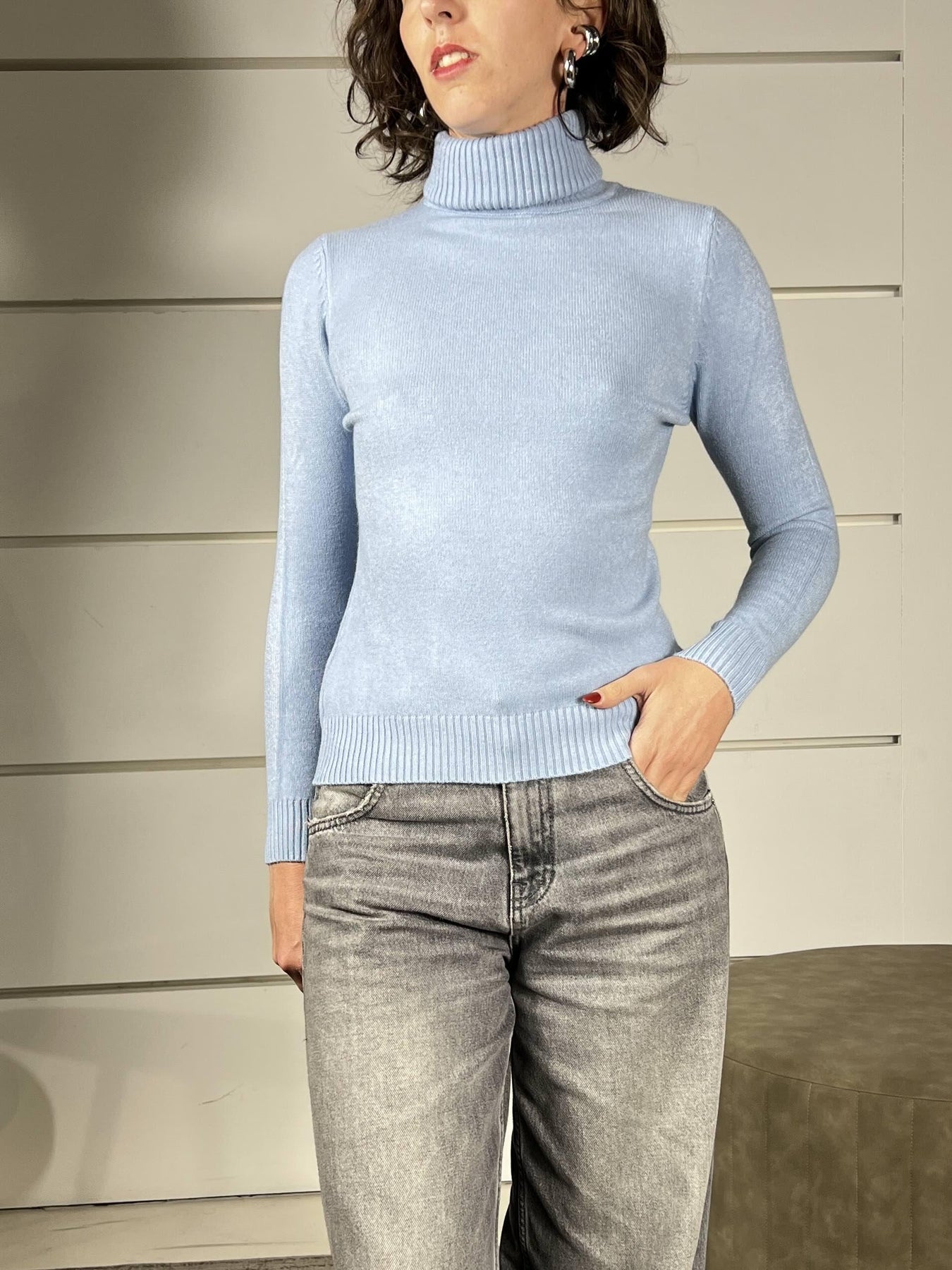 dolcevita Susy Mix pesante cielo, in viscosa elasticizzata. La modella è una 40 ed è alta 172cm, veste da una 38 a una 46. Composizione 55%vi 45%ny blu