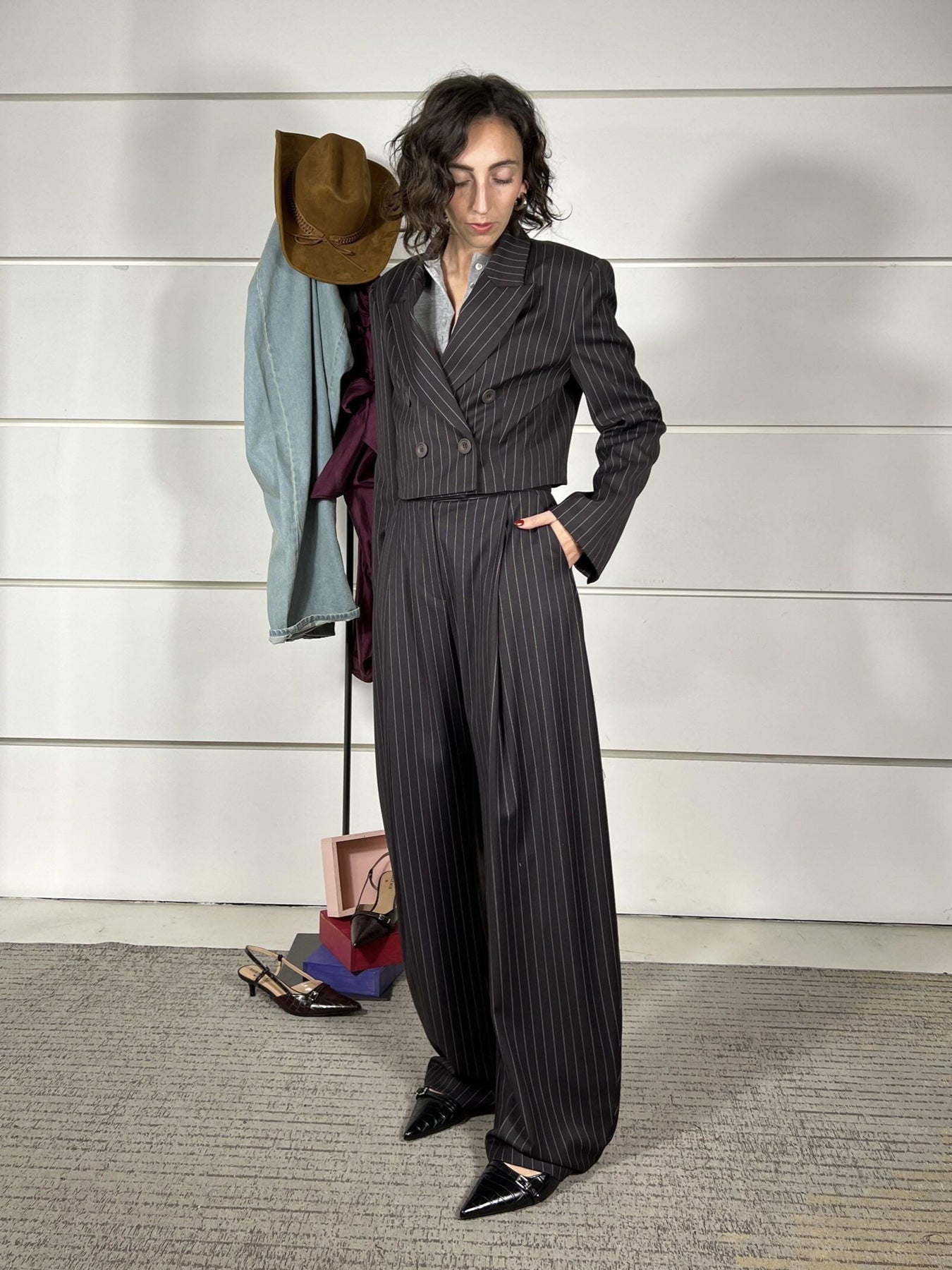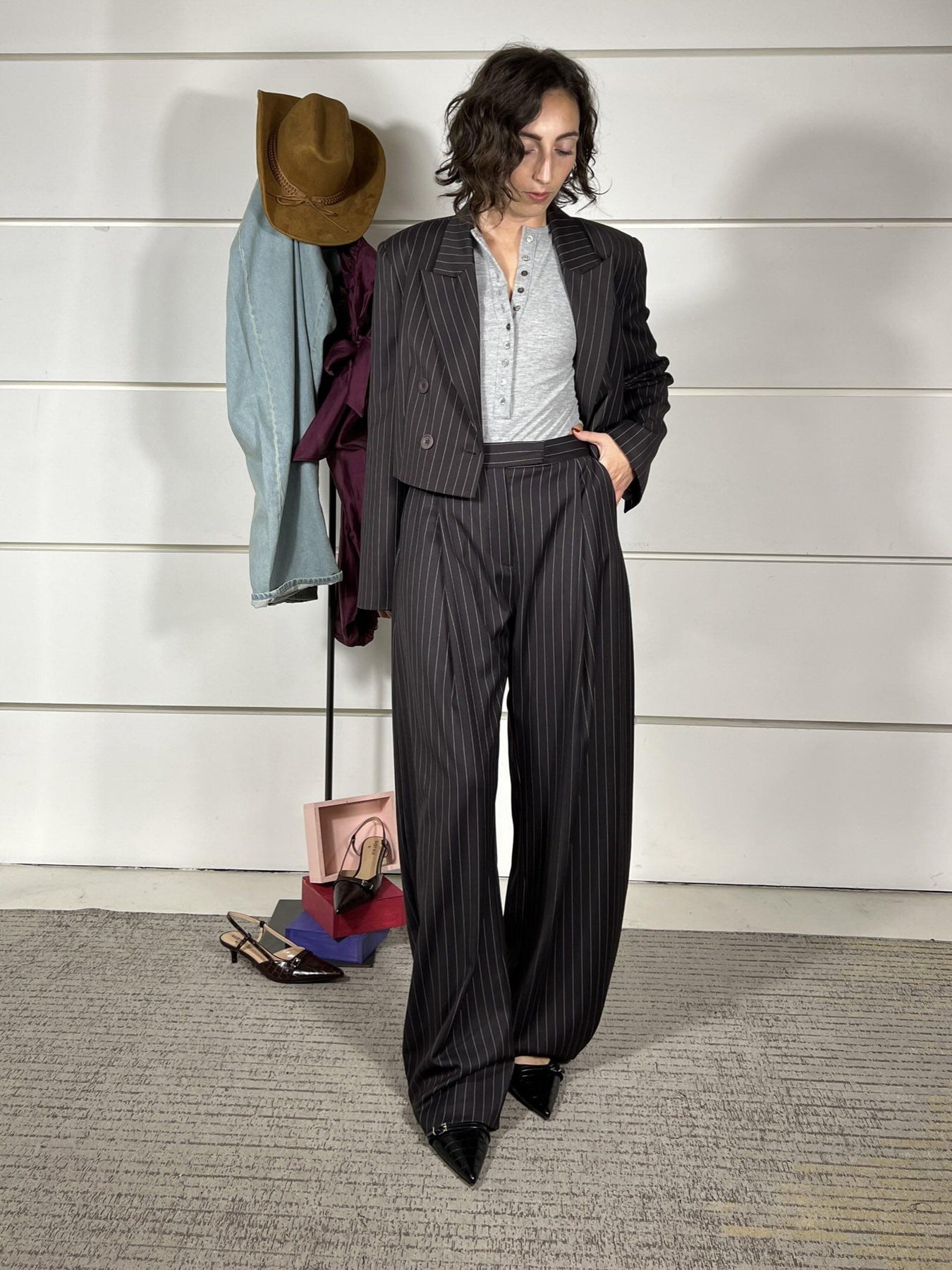Pantalone Imperial moro barrel fit, gessato, la modella indossa la s ed è alta 172cm