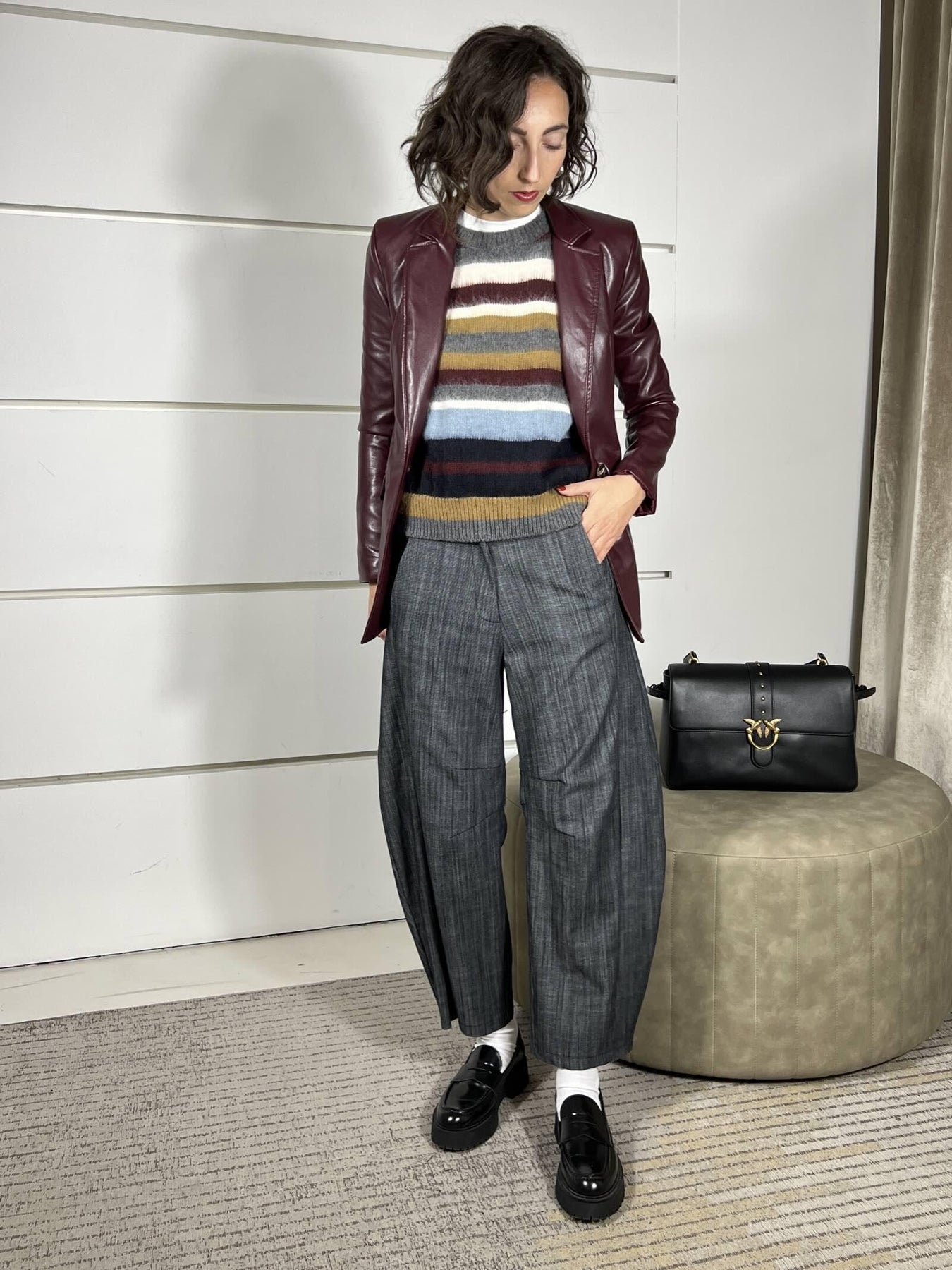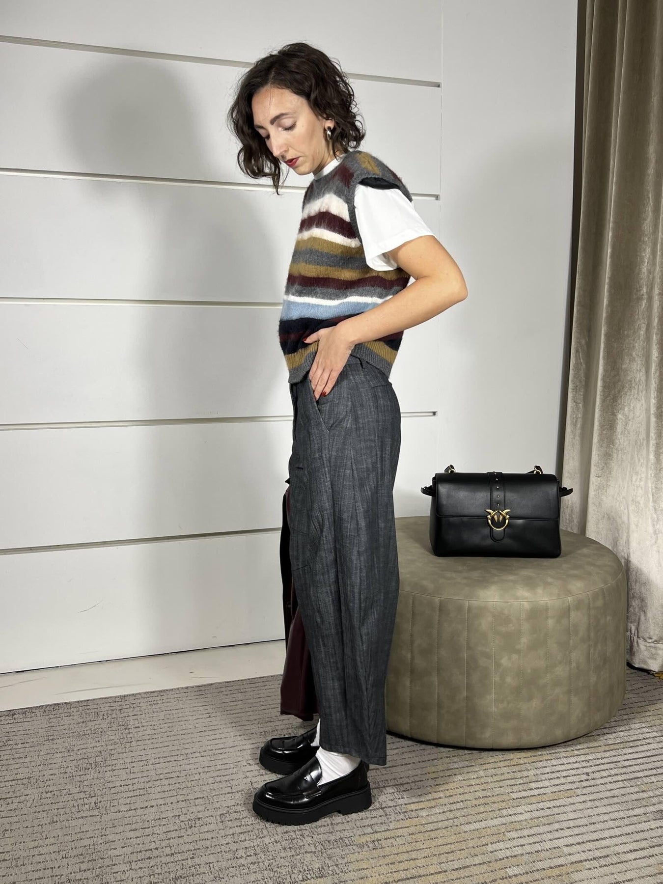 pantalone Imperial nero stone wash, barrel fit , la modella indossa la xxs ed è una 40 ed è alta 172cm , veste abbondante. composizione 70%co 27%pl 3%ea