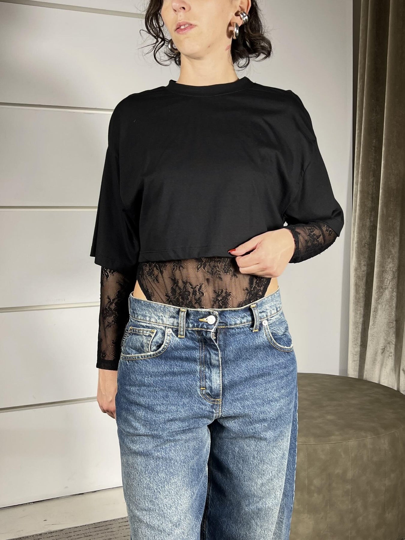 t-shirt Vicolo nera con body in pizzo con manica lunga, la modella indossa la s ed è alta 172cm. Composizione 100%co 95%pl 5%ea